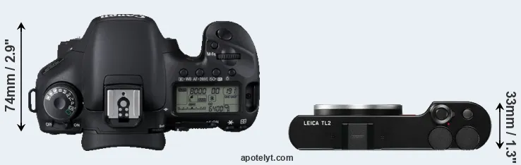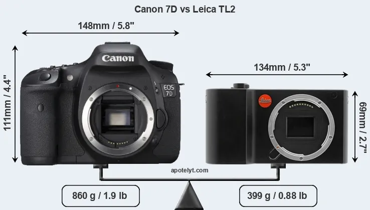 The physical size and weight of the Canon 7D and the Leica TL2 are illustrated in the side-by-side display below. The two cameras are presented according to their relative size. Three successive views from the front, the top, and the rear are shown. All width, height and depth measures are rounded to the nearest millimeter.