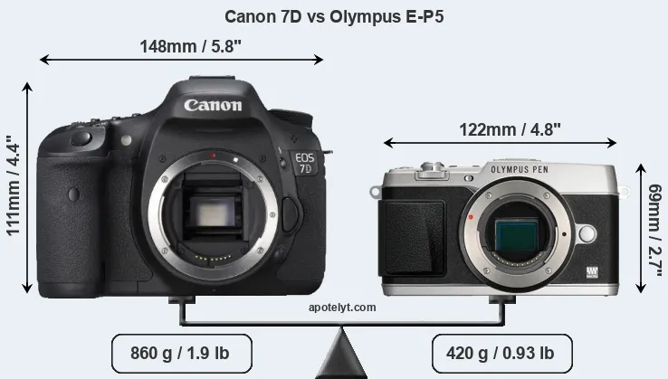 An illustration of the physical size and weight of the Canon 7D and the Olympus E-P5 is provided in the side-by-side display below. The two cameras are presented according to their relative size. Three consecutive perspectives from the front, the top, and the back are available. All width, height and depth measures are rounded to the nearest millimeter.