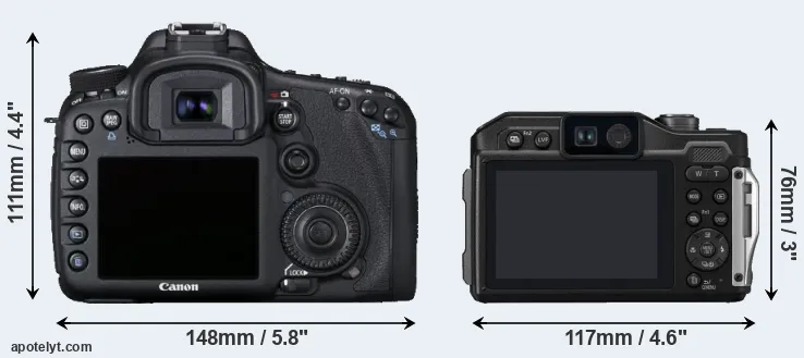 The physical size and weight of the Canon 7D and the Panasonic FT7 are illustrated in the side-by-side display below. The two cameras are presented according to their relative size. Three consecutive views from the front, the top, and the rear side are shown. All size dimensions are rounded to the nearest millimeter.