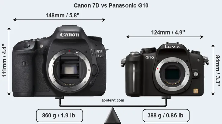 If the front view area (width x height) of the cameras is taken as an aggregate measure of their size, the Panasonic G10 is considerably smaller (37 percent) than the Canon 7D. Moreover, the G10 is substantially lighter (55 percent) than the 7D. It is worth mentioning in this context that the 7D is splash and dust resistant, while the G10 does not feature any corresponding weather-sealing.