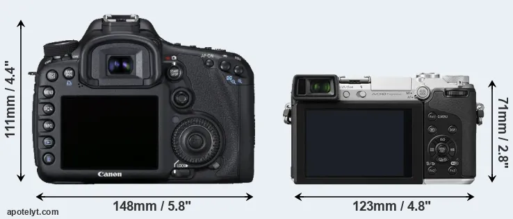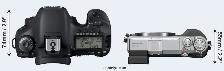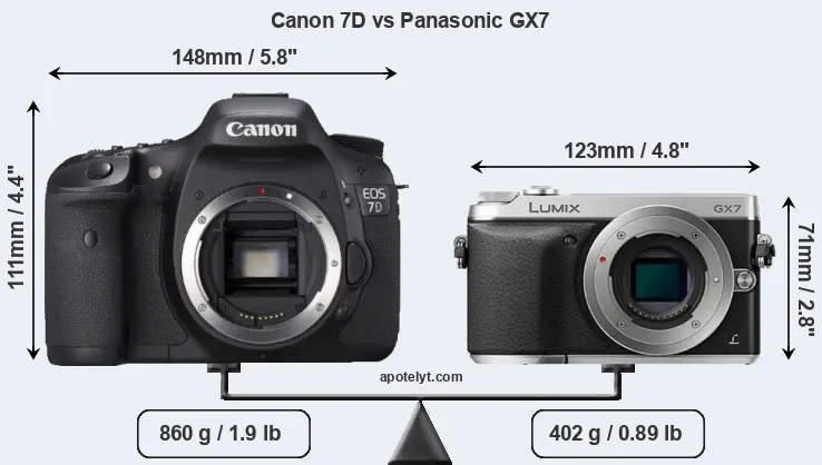 An illustration of the physical size and weight of the Canon 7D and the Panasonic GX7 is provided in the side-by-side display below. The two cameras are presented according to their relative size. Three consecutive views from the front, the top, and the rear side are shown. All width, height and depth measures are rounded to the nearest millimeter.