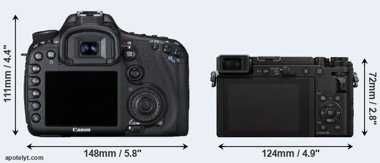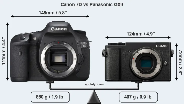 The side-by-side display below illustrates the physical size and weight of the Canon 7D and the Panasonic GX9. The two cameras are presented according to their relative size. Three consecutive views from the front, the top, and the rear side are shown. All width, height and depth measures are rounded to the nearest millimeter.