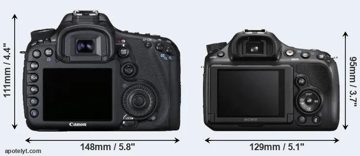 The side-by-side display below illustrates the physical size and weight of the Canon 7D and the Sony A58. The two cameras are presented according to their relative size. Three successive views from the front, the top, and the rear are shown. All size dimensions are rounded to the nearest millimeter.
