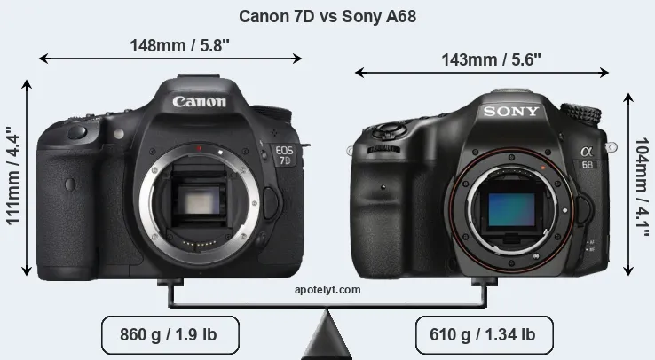 The side-by-side display below illustrates the physical size and weight of the Canon 7D and the Sony A68. The two cameras are presented according to their relative size. Three consecutive views from the front, the top, and the rear side are shown. All width, height and depth measures are rounded to the nearest millimeter.