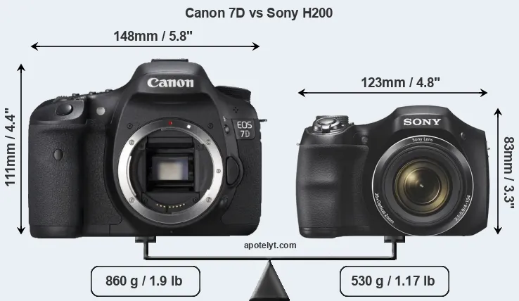The side-by-side display below illustrates the physical size and weight of the Canon 7D and the Sony H200. The two cameras are presented according to their relative size. Three consecutive views from the front, the top, and the rear side are shown. All width, height and depth dimensions are rounded to the nearest millimeter.
