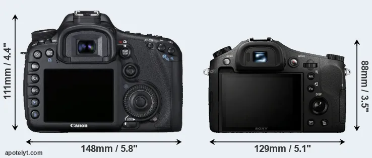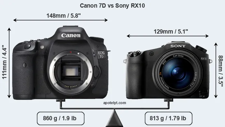 An illustration of the physical size and weight of the Canon 7D and the Sony RX10 is provided in the side-by-side display below. The two cameras are presented according to their relative size. Three successive views from the front, the top, and the rear are shown. All width, height and depth dimensions are rounded to the nearest millimeter.