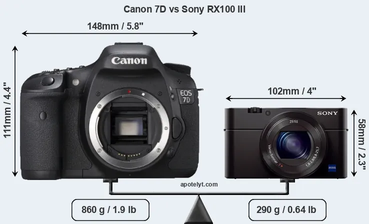 If the front view area (width x height) of the cameras is taken as an aggregate measure of their size, the Sony RX100 III is considerably smaller (64 percent) than the Canon 7D. It is worth mentioning in this context that the 7D is splash and dust resistant, while the RX100 III does not feature any corresponding weather-sealing.