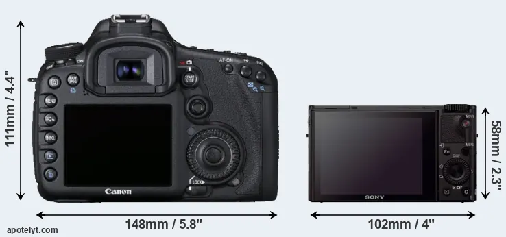 The physical size and weight of the Canon 7D and the Sony RX100 III are illustrated in the side-by-side display below. The two cameras are presented according to their relative size. Three consecutive perspectives from the front, the top, and the back are available. All width, height and depth dimensions are rounded to the nearest millimeter.