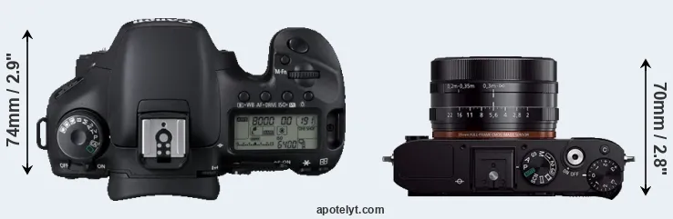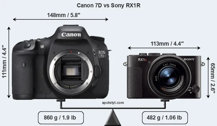 The side-by-side display below illustrates the physical size and weight of the Canon 7D and the Sony RX1R. The two cameras are presented according to their relative size. Three consecutive perspectives from the front, the top, and the back are available. All size dimensions are rounded to the nearest millimeter.
