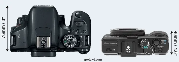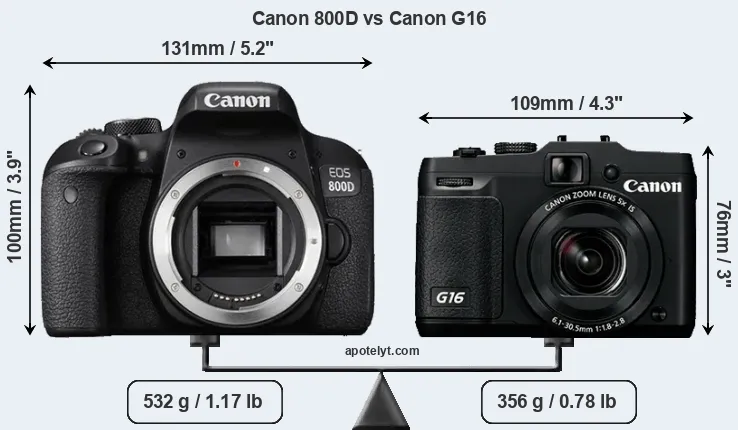 An illustration of the physical size and weight of the Canon 800D and the Canon G16 is provided in the side-by-side display below. The two cameras are presented according to their relative size. Three consecutive views from the front, the top, and the rear side are shown. All width, height and depth measures are rounded to the nearest millimeter.