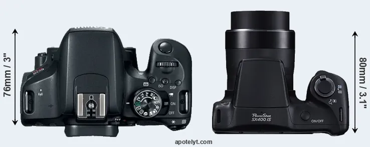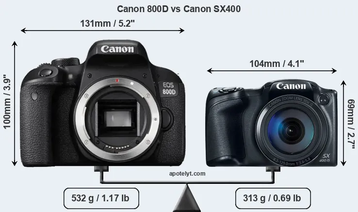 An illustration of the physical size and weight of the Canon 800D and the Canon SX400 is provided in the side-by-side display below. The two cameras are presented according to their relative size. Three consecutive views from the front, the top, and the rear side are shown. All width, height and depth measures are rounded to the nearest millimeter.