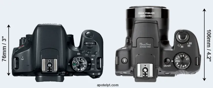 An illustration of the physical size and weight of the Canon 800D and the Canon SX50 is provided in the side-by-side display below. The two cameras are presented according to their relative size. Three consecutive perspectives from the front, the top, and the back are available. All size dimensions are rounded to the nearest millimeter.