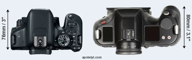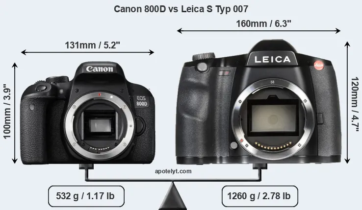 The physical size and weight of the Canon 800D and the Leica S Typ 007 are illustrated in the side-by-side display below. The two cameras are presented according to their relative size. Three consecutive views from the front, the top, and the rear side are shown. All width, height and depth measures are rounded to the nearest millimeter.