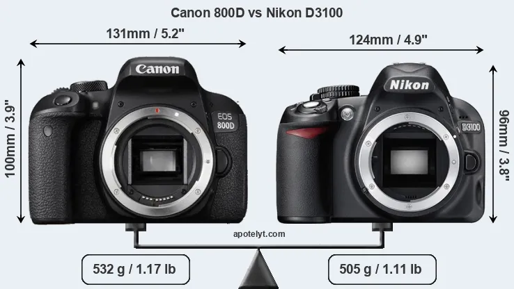 An illustration of the physical size and weight of the Canon 800D and the Nikon D3100 is provided in the side-by-side display below. The two cameras are presented according to their relative size. Three consecutive perspectives from the front, the top, and the back are available. All width, height and depth measures are rounded to the nearest millimeter.
