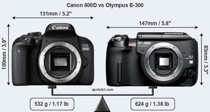 The side-by-side display below illustrates the physical size and weight of the Canon 800D and the Olympus E-300. The two cameras are presented according to their relative size. Three consecutive perspectives from the front, the top, and the back are available. All width, height and depth dimensions are rounded to the nearest millimeter.