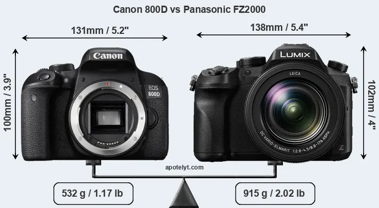 An illustration of the physical size and weight of the Canon 800D and the Panasonic FZ2000 is provided in the side-by-side display below. The two cameras are presented according to their relative size. Three consecutive perspectives from the front, the top, and the back are available. All width, height and depth measures are rounded to the nearest millimeter.