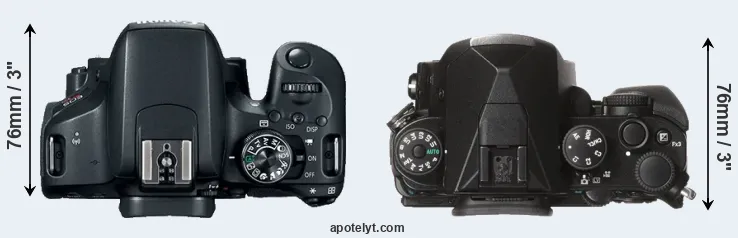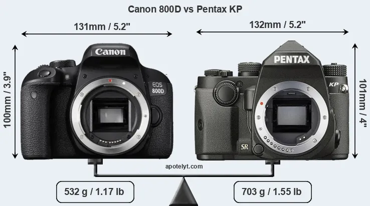 The physical size and weight of the Canon 800D and the Pentax KP are illustrated in the side-by-side display below. The two cameras are presented according to their relative size. Three consecutive views from the front, the top, and the rear side are shown. All size dimensions are rounded to the nearest millimeter.