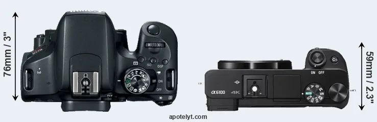 The side-by-side display below illustrates the physical size and weight of the Canon 800D and the Sony A6100. The two cameras are presented according to their relative size. Three successive views from the front, the top, and the rear are shown. All width, height and depth measures are rounded to the nearest millimeter.