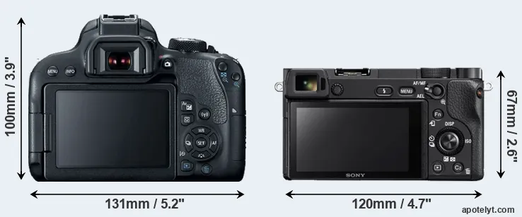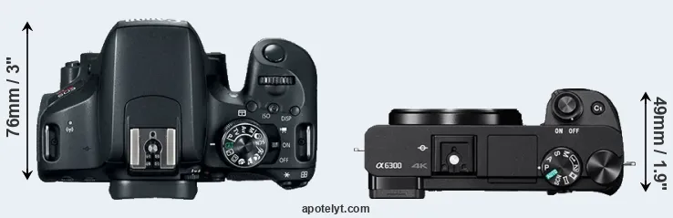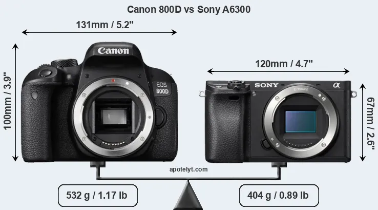 The side-by-side display below illustrates the physical size and weight of the Canon 800D and the Sony A6300. The two cameras are presented according to their relative size. Three successive views from the front, the top, and the rear are shown. All width, height and depth measures are rounded to the nearest millimeter.
