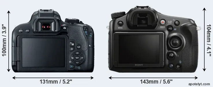 Going beyond this snapshot of core features and characteristics, what are the differences between the Canon EOS 800D and the Sony Alpha SLT-A68? Which one should you buy? Read on to find out how these two cameras compare with respect to their body size, their imaging sensors, their shooting features, their input-output connections, and their reception by expert reviewers.