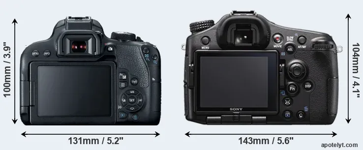 The side-by-side display below illustrates the physical size and weight of the Canon 800D and the Sony A77 II. The two cameras are presented according to their relative size. Three successive views from the front, the top, and the rear are shown. All size dimensions are rounded to the nearest millimeter.