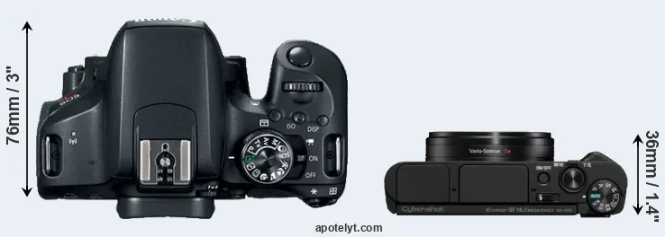The side-by-side display below illustrates the physical size and weight of the Canon 800D and the Sony HX95. The two cameras are presented according to their relative size. Three consecutive views from the front, the top, and the rear side are shown. All width, height and depth measures are rounded to the nearest millimeter.