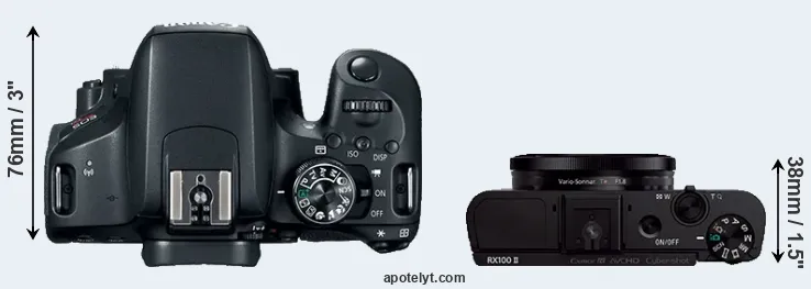 The physical size and weight of the Canon 800D and the Sony RX100 II are illustrated in the side-by-side display below. The two cameras are presented according to their relative size. Three consecutive perspectives from the front, the top, and the back are available. All width, height and depth measures are rounded to the nearest millimeter.