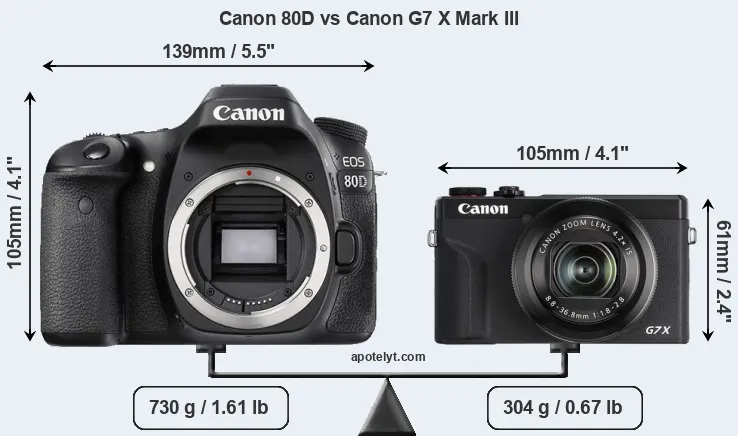 An illustration of the physical size and weight of the Canon 80D and the Canon G7 X Mark III is provided in the side-by-side display below. The two cameras are presented according to their relative size. Three successive views from the front, the top, and the rear are shown. All width, height and depth measures are rounded to the nearest millimeter.