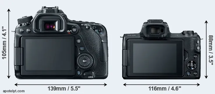 The side-by-side display below illustrates the physical size and weight of the Canon 80D and the Canon M50. The two cameras are presented according to their relative size. Three consecutive perspectives from the front, the top, and the back are available. All width, height and depth measures are rounded to the nearest millimeter.