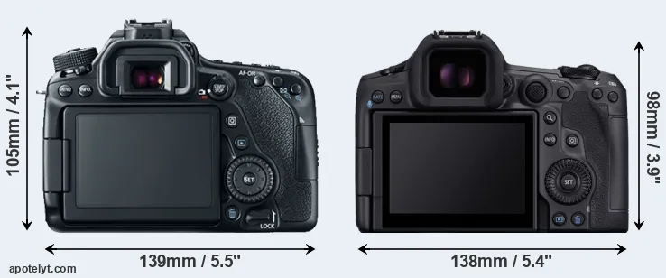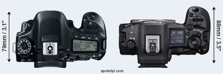 The physical size and weight of the Canon 80D and the Canon R5 Mark II are illustrated in the side-by-side display below. The two cameras are presented according to their relative size. Three consecutive perspectives from the front, the top, and the back are available. All width, height and depth dimensions are rounded to the nearest millimeter.