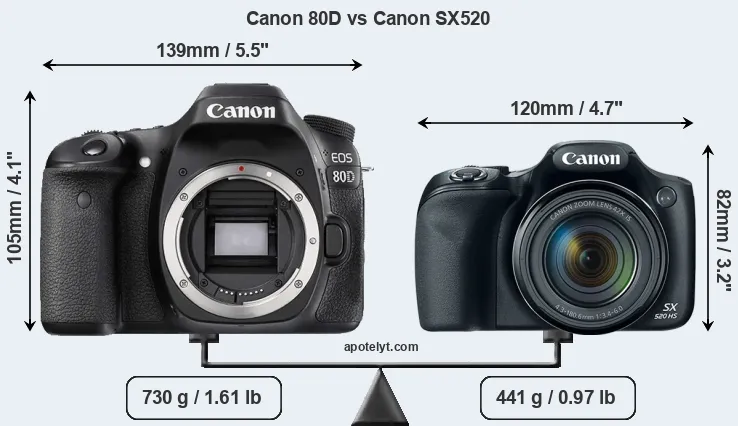 The side-by-side display below illustrates the physical size and weight of the Canon 80D and the Canon SX520. The two cameras are presented according to their relative size. Three consecutive perspectives from the front, the top, and the back are available. All width, height and depth measures are rounded to the nearest millimeter.