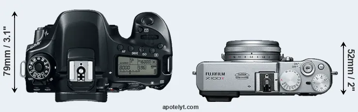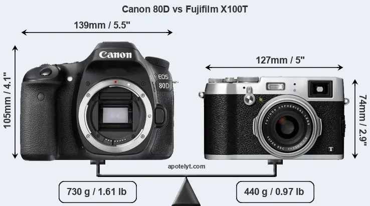 An illustration of the physical size and weight of the Canon 80D and the Fujifilm X100T is provided in the side-by-side display below. The two cameras are presented according to their relative size. Three consecutive perspectives from the front, the top, and the back are available. All size dimensions are rounded to the nearest millimeter.