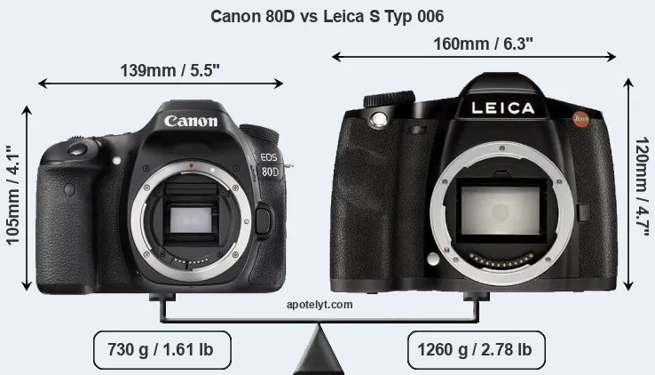 The physical size and weight of the Canon 80D and the Leica S Typ 006 are illustrated in the side-by-side display below. The two cameras are presented according to their relative size. Three consecutive perspectives from the front, the top, and the back are available. All size dimensions are rounded to the nearest millimeter.