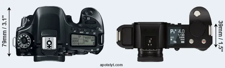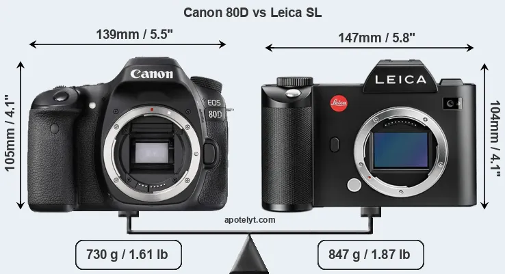 The side-by-side display below illustrates the physical size and weight of the Canon 80D and the Leica SL. The two cameras are presented according to their relative size. Three successive views from the front, the top, and the rear are shown. All size dimensions are rounded to the nearest millimeter.
