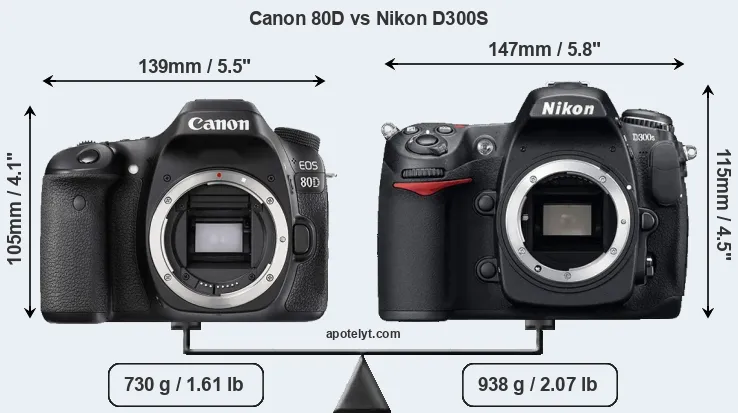 The side-by-side display below illustrates the physical size and weight of the Canon 80D and the Nikon D300S. The two cameras are presented according to their relative size. Three successive views from the front, the top, and the rear are shown. All size dimensions are rounded to the nearest millimeter.