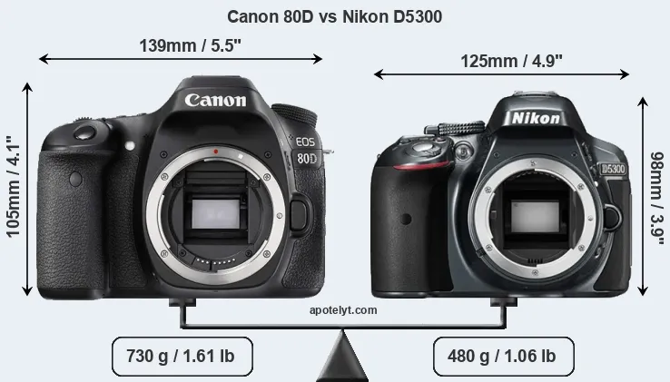 If the front view area (width x height) of the cameras is taken as an aggregate measure of their size, the Nikon D5300 is notably smaller (16 percent) than the Canon 80D. Moreover, the D5300 is markedly lighter (34 percent) than the 80D. It is worth mentioning in this context that the 80D is splash and dust resistant, while the D5300 does not feature any corresponding weather-sealing.