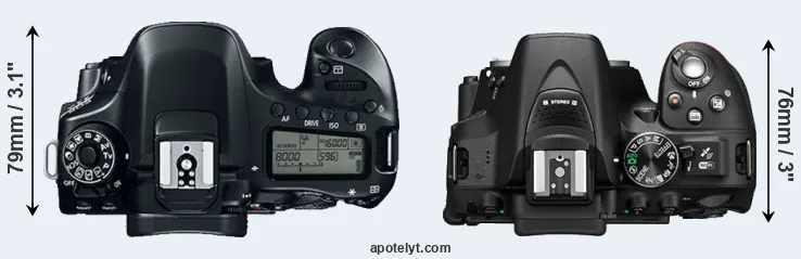The side-by-side display below illustrates the physical size and weight of the Canon 80D and the Nikon D5300. The two cameras are presented according to their relative size. Three successive views from the front, the top, and the rear are shown. All size dimensions are rounded to the nearest millimeter.