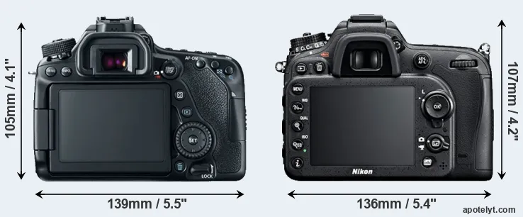 The physical size and weight of the Canon 80D and the Nikon D7100 are illustrated in the side-by-side display below. The two cameras are presented according to their relative size. Three successive views from the front, the top, and the rear are shown. All width, height and depth dimensions are rounded to the nearest millimeter.