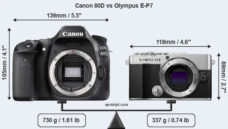 If the front view area (width x height) of the cameras is taken as an aggregate measure of their size, the Olympus E-P7 is considerably smaller (44 percent) than the Canon 80D. Moreover, the E-P7 is substantially lighter (54 percent) than the 80D. It is worth mentioning in this context that the 80D is splash and dust resistant, while the E-P7 does not feature any corresponding weather-sealing.