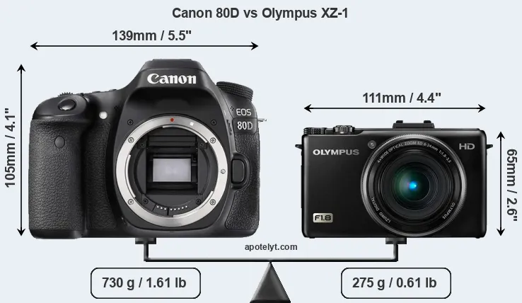 If the front view area (width x height) of the cameras is taken as an aggregate measure of their size, the Olympus XZ-1 is considerably smaller (51 percent) than the Canon 80D. It is worth mentioning in this context that the 80D is splash and dust resistant, while the XZ-1 does not feature any corresponding weather-sealing.