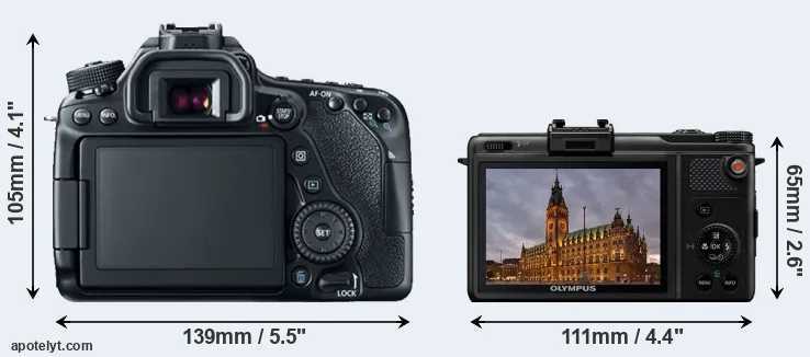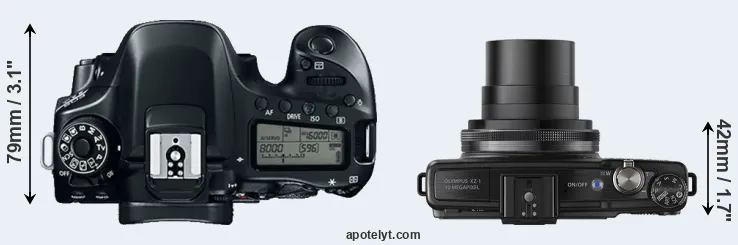 The side-by-side display below illustrates the physical size and weight of the Canon 80D and the Olympus XZ-1. The two cameras are presented according to their relative size. Three successive views from the front, the top, and the rear are shown. All size dimensions are rounded to the nearest millimeter.
