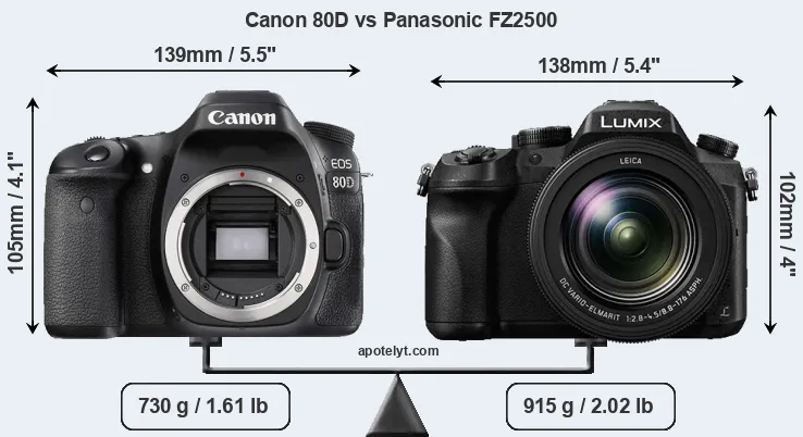 An illustration of the physical size and weight of the Canon 80D and the Panasonic FZ2500 is provided in the side-by-side display below. The two cameras are presented according to their relative size. Three consecutive views from the front, the top, and the rear side are shown. All width, height and depth dimensions are rounded to the nearest millimeter.