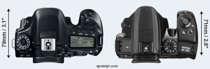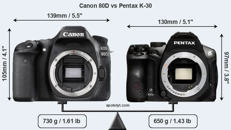 The side-by-side display below illustrates the physical size and weight of the Canon 80D and the Pentax K-30. The two cameras are presented according to their relative size. Three consecutive perspectives from the front, the top, and the back are available. All size dimensions are rounded to the nearest millimeter.
