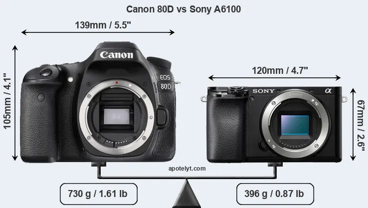 If the front view area (width x height) of the cameras is taken as an aggregate measure of their size, the Sony A6100 is considerably smaller (45 percent) than the Canon 80D. Moreover, the A6100 is substantially lighter (46 percent) than the 80D. It is worth mentioning in this context that the 80D is splash and dust resistant, while the A6100 does not feature any corresponding weather-sealing.