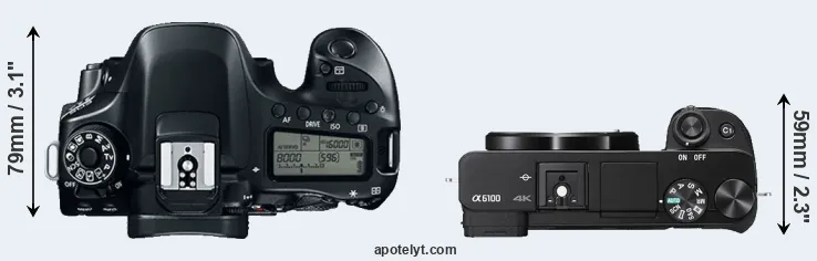 The physical size and weight of the Canon 80D and the Sony A6100 are illustrated in the side-by-side display below. The two cameras are presented according to their relative size. Three consecutive views from the front, the top, and the rear side are shown. All size dimensions are rounded to the nearest millimeter.