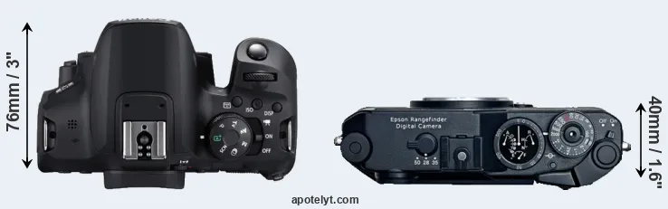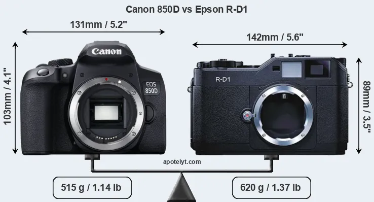 An illustration of the physical size and weight of the Canon 850D and the Epson R-D1 is provided in the side-by-side display below. The two cameras are presented according to their relative size. Three successive views from the front, the top, and the rear are shown. All size dimensions are rounded to the nearest millimeter.