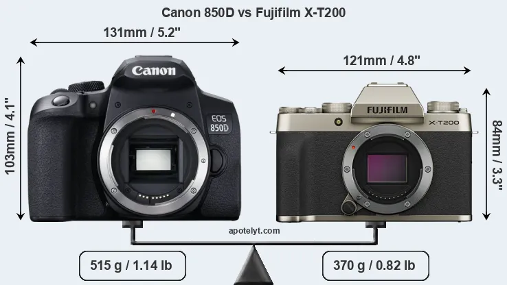 The physical size and weight of the Canon 850D and the Fujifilm X-T200 are illustrated in the side-by-side display below. The two cameras are presented according to their relative size. Three successive views from the front, the top, and the rear are shown. All width, height and depth measures are rounded to the nearest millimeter.