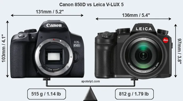 The above size and weight comparisons are to some extent incomplete and possibly misleading, as the V-LUX 5 has a lens built in, whereas the 850D is an interchangeable lens camera that requires a separate lens. Attaching the latter will add extra weight and bulk to the setup. You can compare the optics available for the 850D and their specifications in the Canon EF Lens Catalog.