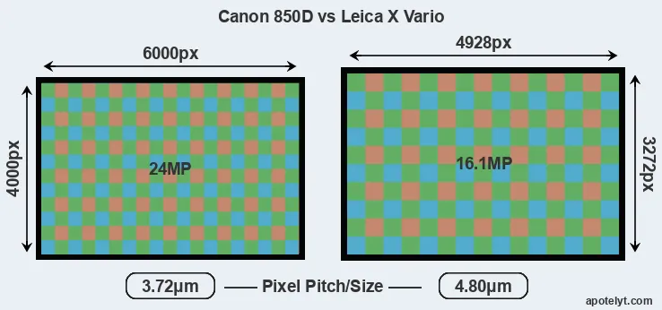 Despite having a smaller sensor, the Canon 850D offers a higher resolution of 24 megapixels, compared with 16.1 MP of the Leica X Vario. This megapixels advantage comes at the cost of a higher pixel density and a smaller size of the individual pixel (with a pixel pitch of 3.72μm versus 4.80μm for the X Vario). However, it should be noted that the 850D is much more recent (by 6 years and 8 months) than the X Vario, and its sensor will have benefitted from technological advances during this time that make it possible to gather light more efficiently.