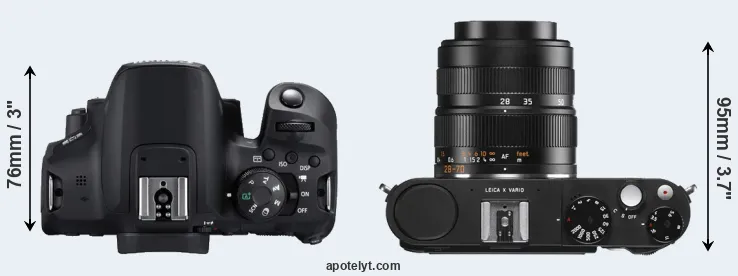 The side-by-side display below illustrates the physical size and weight of the Canon 850D and the Leica X Vario. The two cameras are presented according to their relative size. Three consecutive views from the front, the top, and the rear side are shown. All width, height and depth measures are rounded to the nearest millimeter.